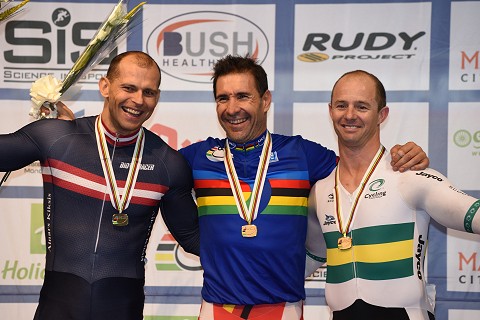 In the best sprinting seen in the event, Jose Escuredo (Spain) added another masters title to the Olympic and World titles he has won in the last ten years. The event was the 40 to 44 years Sprint and Escuredo beat another rider who was competing in World Cups and such only a few years ago, Ainars Kiksis of Latvia.