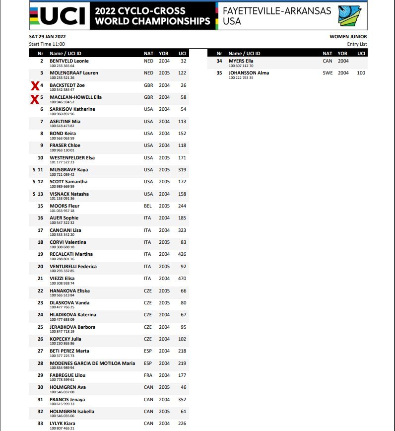 WORLD CX STARTLISTS JUNIOR WOMEN