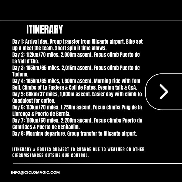 Get in touch to secure your place now! If you would like more information or have any questions just ask. info@ciclomagic.com